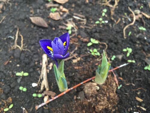 地面すれすれから葉が割れ、いきなり花が咲いてくる。花茎もなく、蕾もなく。 奇妙な花だ。咲いてから花茎が伸びてくるのだろうか。しかもまだ2月。菖蒲は5月以降だろうに、温室育ちで狂ってしまっているのか。それとも矮小化する過程で開花期も変わったのか…